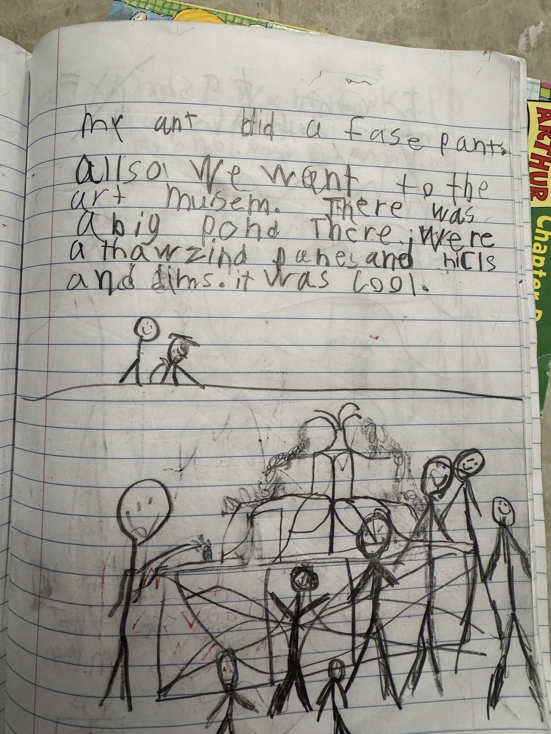 13. The childhood phenomenon of “invented spelling,” described by AI with what I believe to be reasonable accuracy as a stage in a child’s spelling development where they use their knowledge of sounds and letters to create their own spellings of words, often based on how the word sounds. My sister, who is currently in possession of four small children, knows I love it and often sends me pics of their best work, including this beauty where I am featured. 🐜